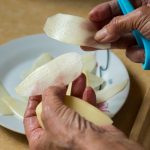 קולפים את שני תפוחי האדמה, ולאחר מכן, בעזרת קולפן, פורסים אותם לרצועות דקיקות. מרטיבים את הידיים, קורצים מעט מן תערובת הקציצות (כמות שוות ערך לכגודל ביצה) ו"מכדררים" לצורת אליפסה סימטרית. מניחים רצועת תפוח אדמה אחת לאורך האליפסה ועוד אחת מן הצד השני שלה (כלומר, מין סנדויץ': רצועת תפוח אדמה, בשר, רצועת תפוח אדמה). חוזרים על הפעולה עם יתר המסה ותפוחי האדמה (כדאי לעבוד עם ידיים רטובות). מניחים את קמח המצה בקערה רחבה, ומקמחים את הקציצות. מנערים אותן קלות כדי שלא תהיה שכבה עבה מדי של קמח. מניחים בצד (דדה מעדיפה לעבוד עם קמח מצה ולא עם קמח לבן מפני שלטעמה הוא מעניק צבע זהוב יפה יותר ומרקם פריך יותר לקציצות).