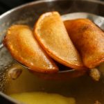מתחילים במלאכת המילוי: מניחים מעט מילוי במרכז העיגול על החלק העליון והמחורר של הפנקייק. מקפלים את הפנקייק לחצי סהר, ומהדקים היטב את הקצוות – כן, הם נדבקים, במיוחד אם הם עדיין חמימים. אם הקצוות קצת נפרדים, זה לא נורא; לפני הטיגון בשמן העמוק, יש להדק אותם שוב.