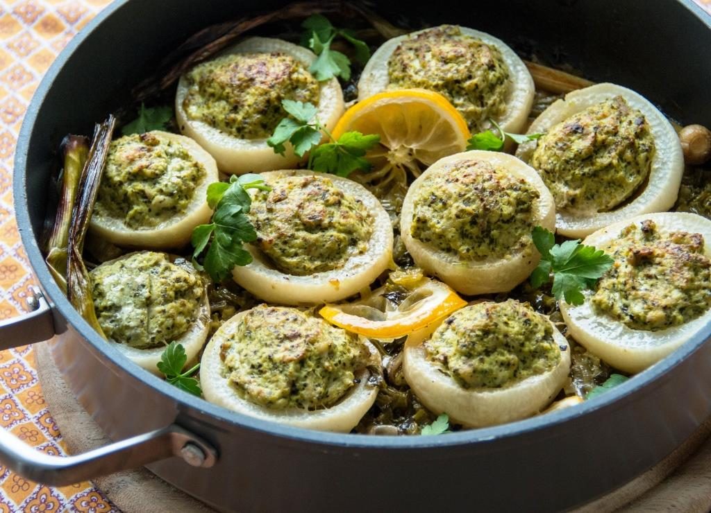 מתכון חגיגי לבצלים ממולאים בבשר, אורז עגול ותבלינים עזי טעם וריח, המתבשלים בתוך רוטב סמיך של רימונים ותרד בר
